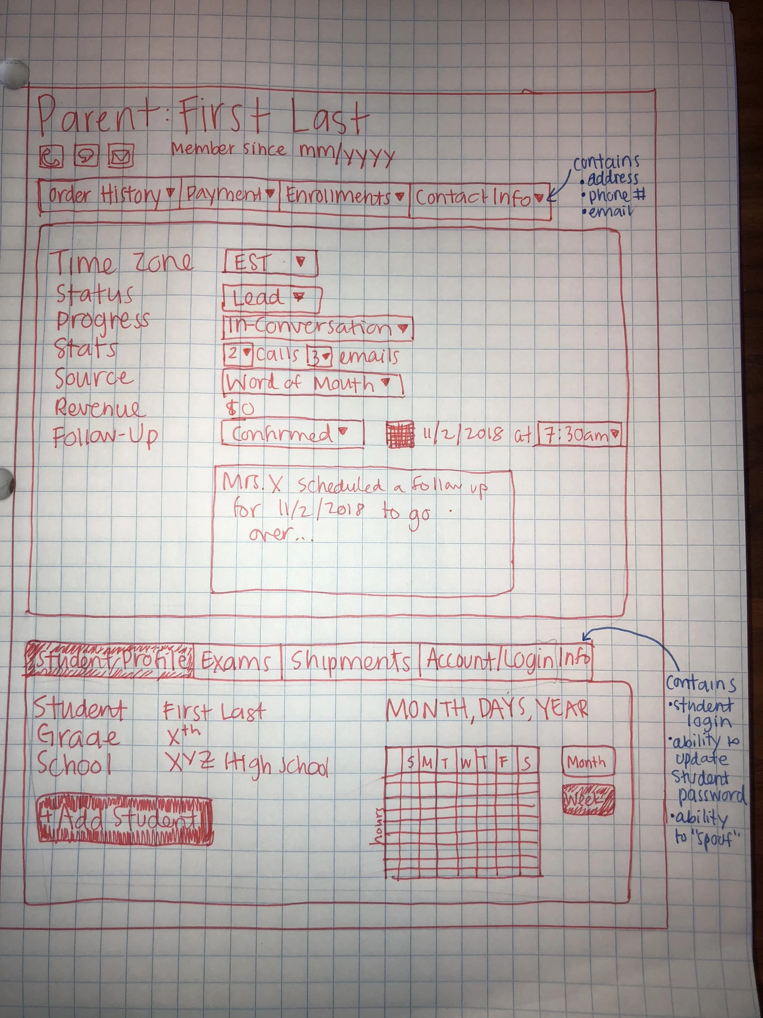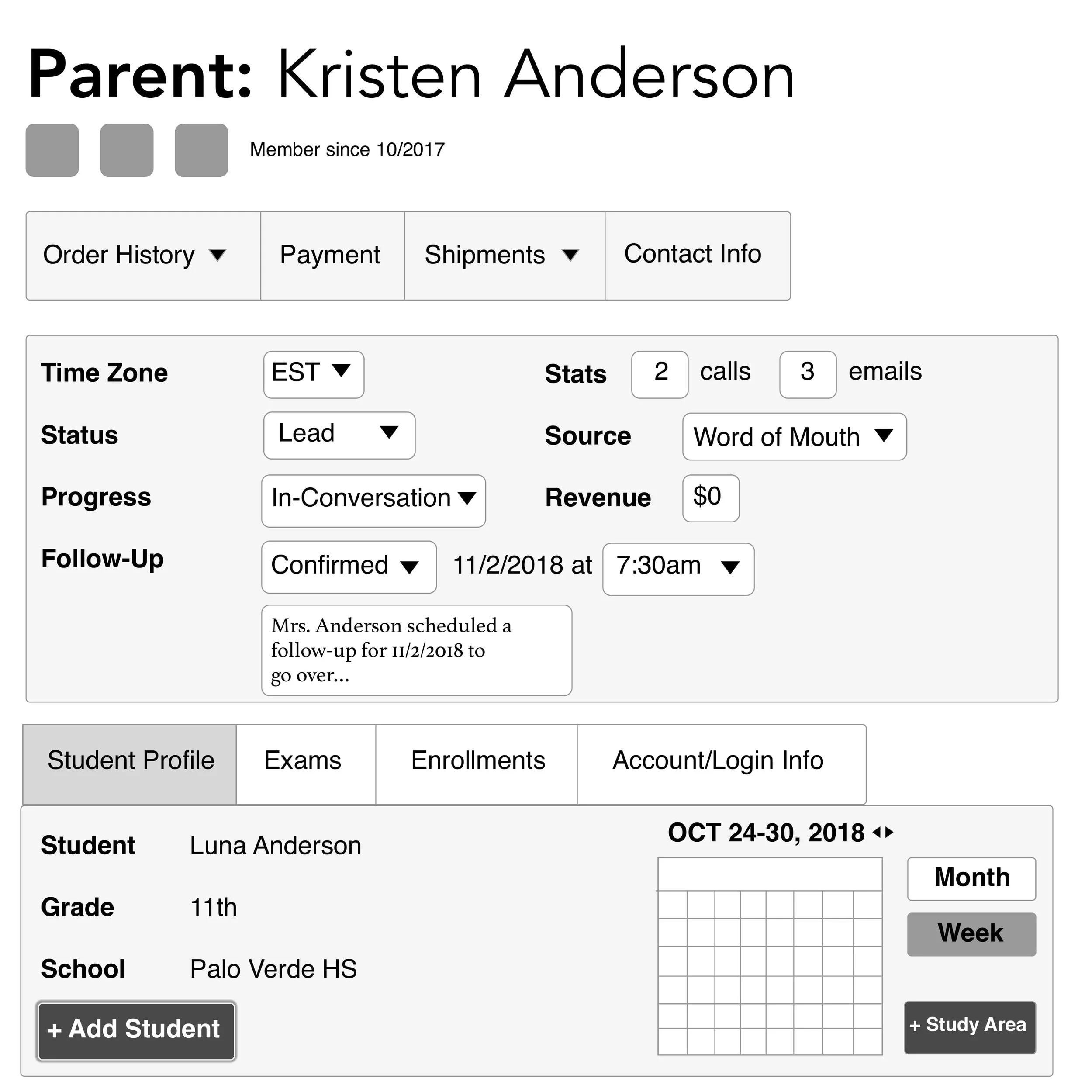 The wireframe is the default view of the parent modal. I categorized the information mainly by what pertains more to the parent vs. the student; therefore, I’ve included order history, payment information, shipments, and contact information in the top bar under the parent’s name. Similarly, I’ve included student name/grade/school, exams, enrollments, and account/login information (which contains the ability to update student password and ability to login as the student) in the student bar below the parent information. The most important sales information is included in the main module (the section starting with time zone) of the parent modal.
